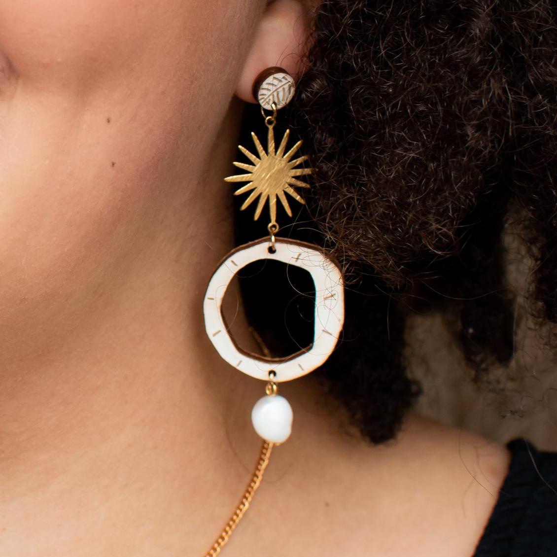 FSC certified plywood, fresh wather pearl, brass sun and 9ct gold plated stud fittings.