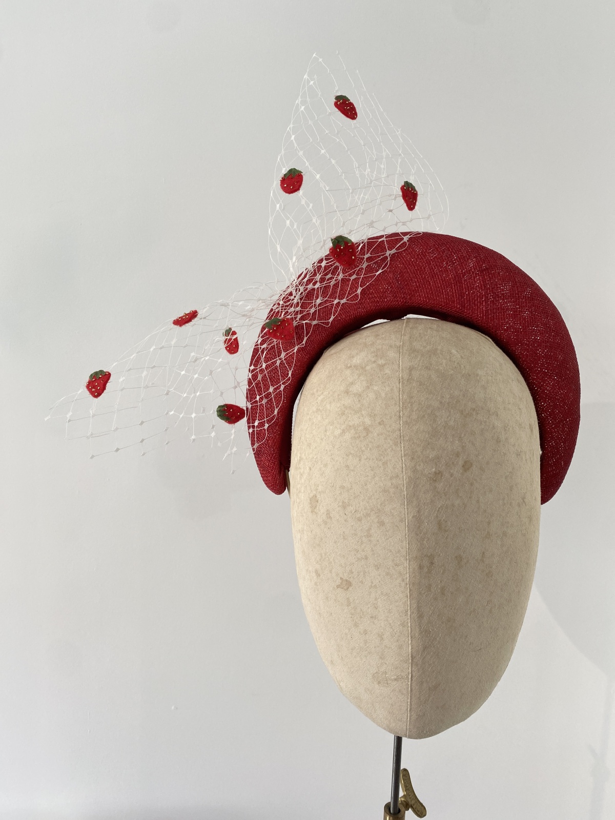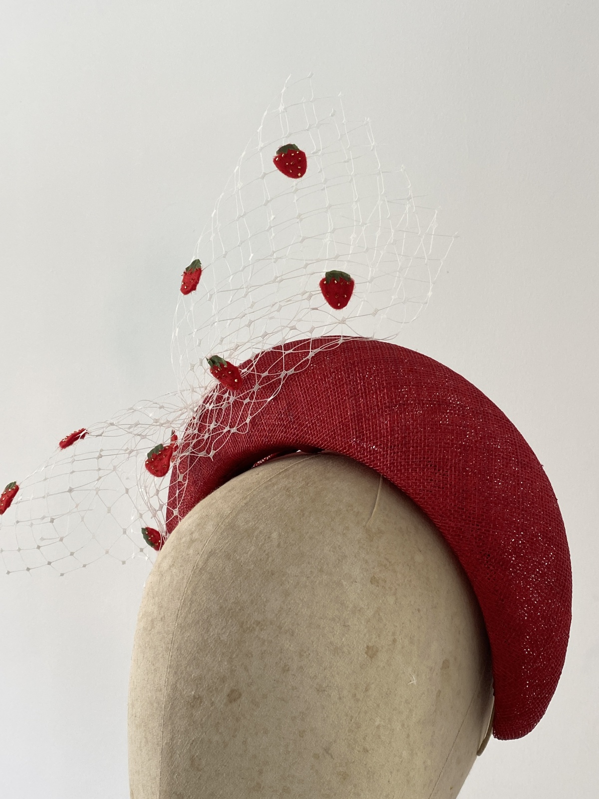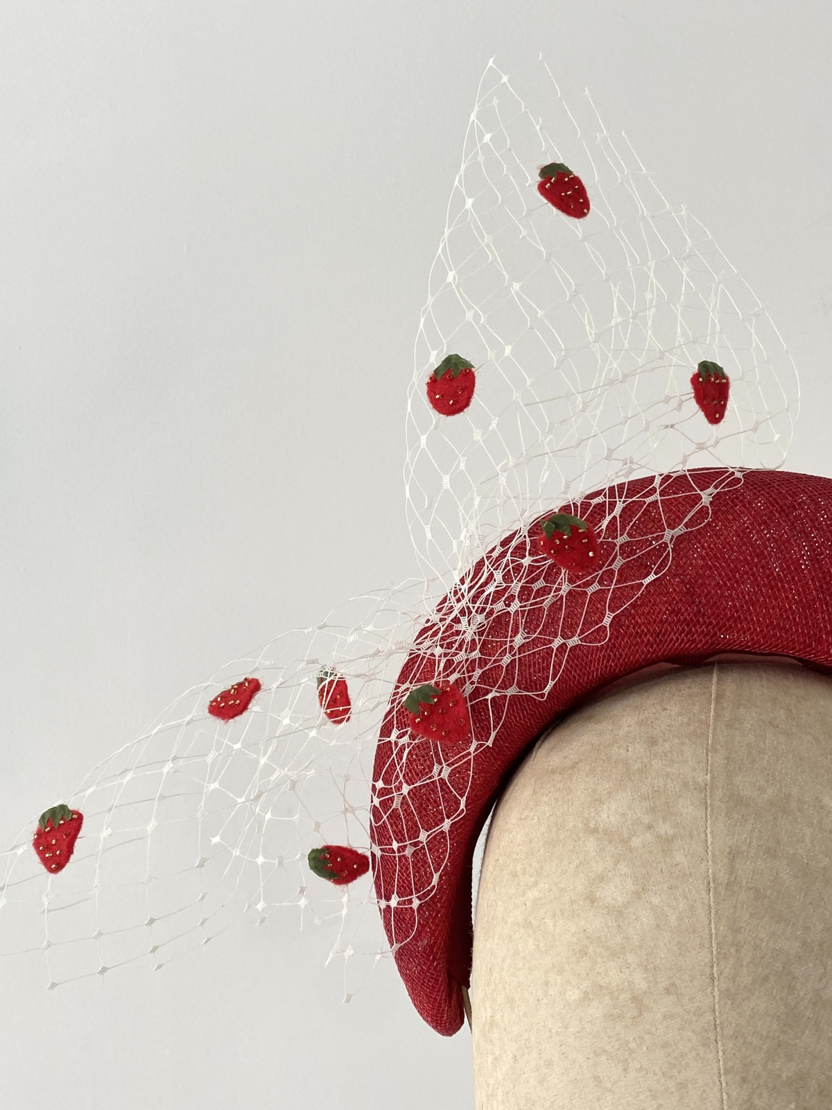 The ‘Daiquiri’ bandeau headband is exquisitely crafted in a vibrant, statement red, accented with a delicate flourish of white veiling and adorned with hand-beaded felt strawberries.