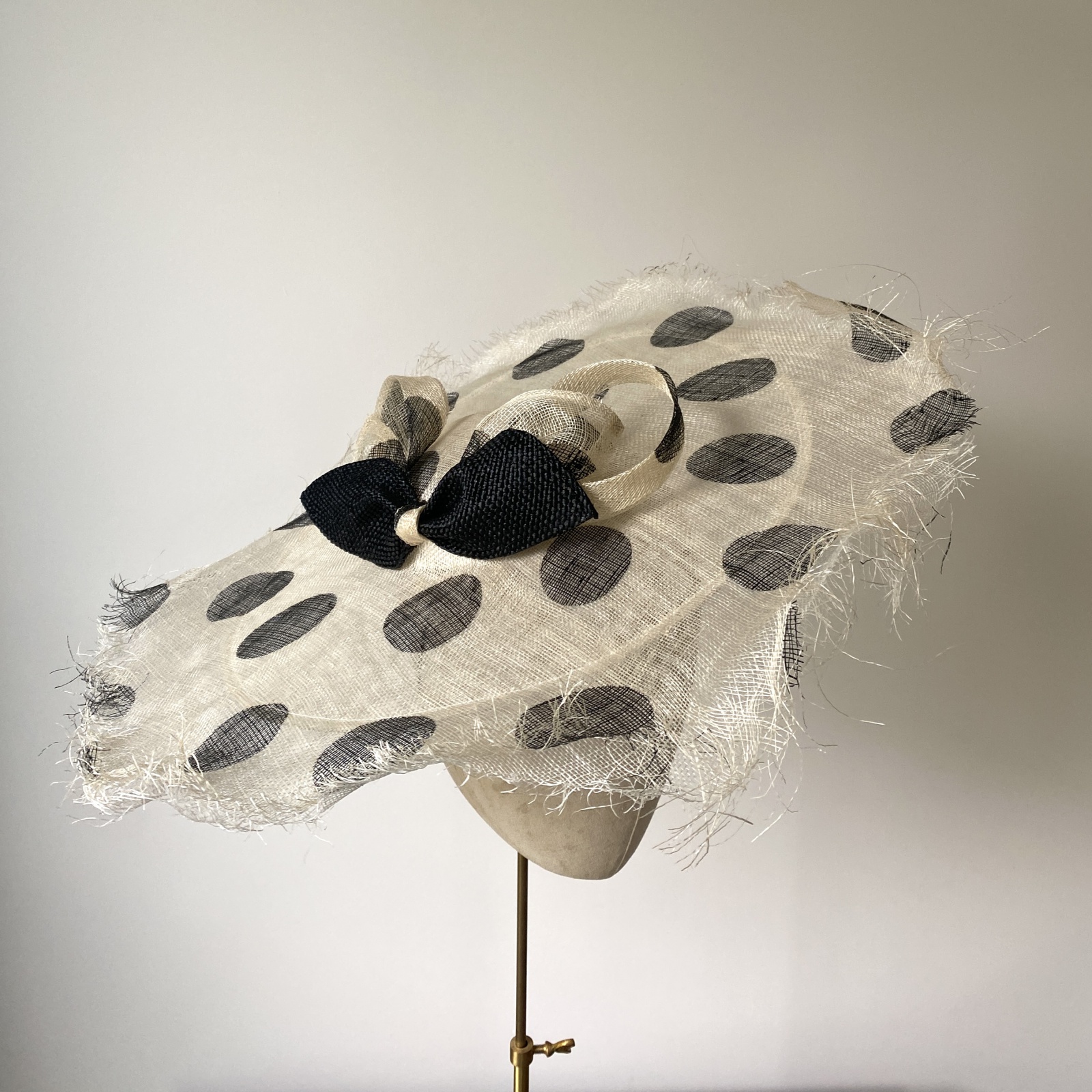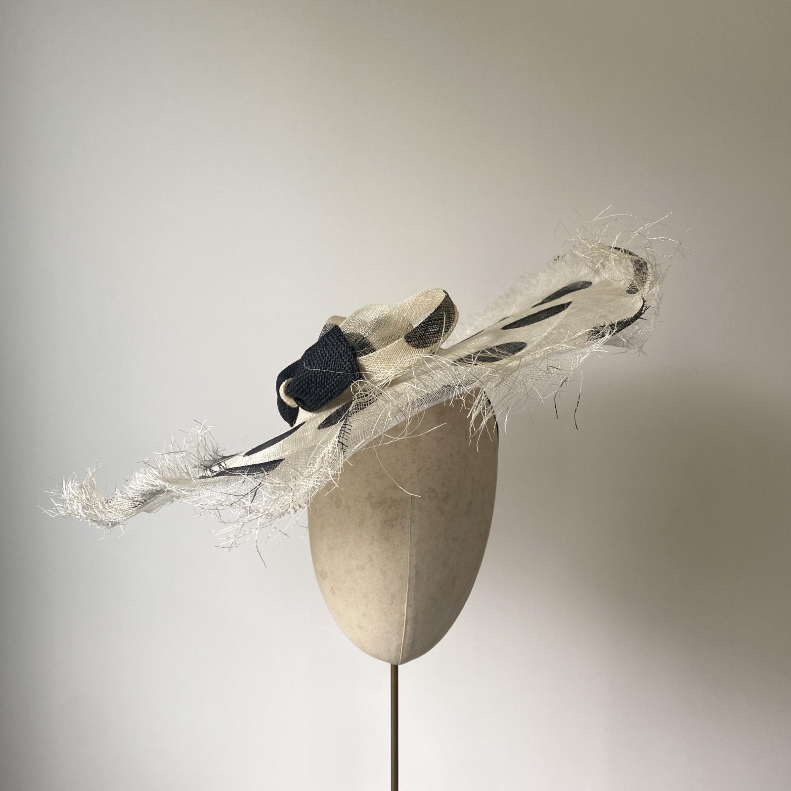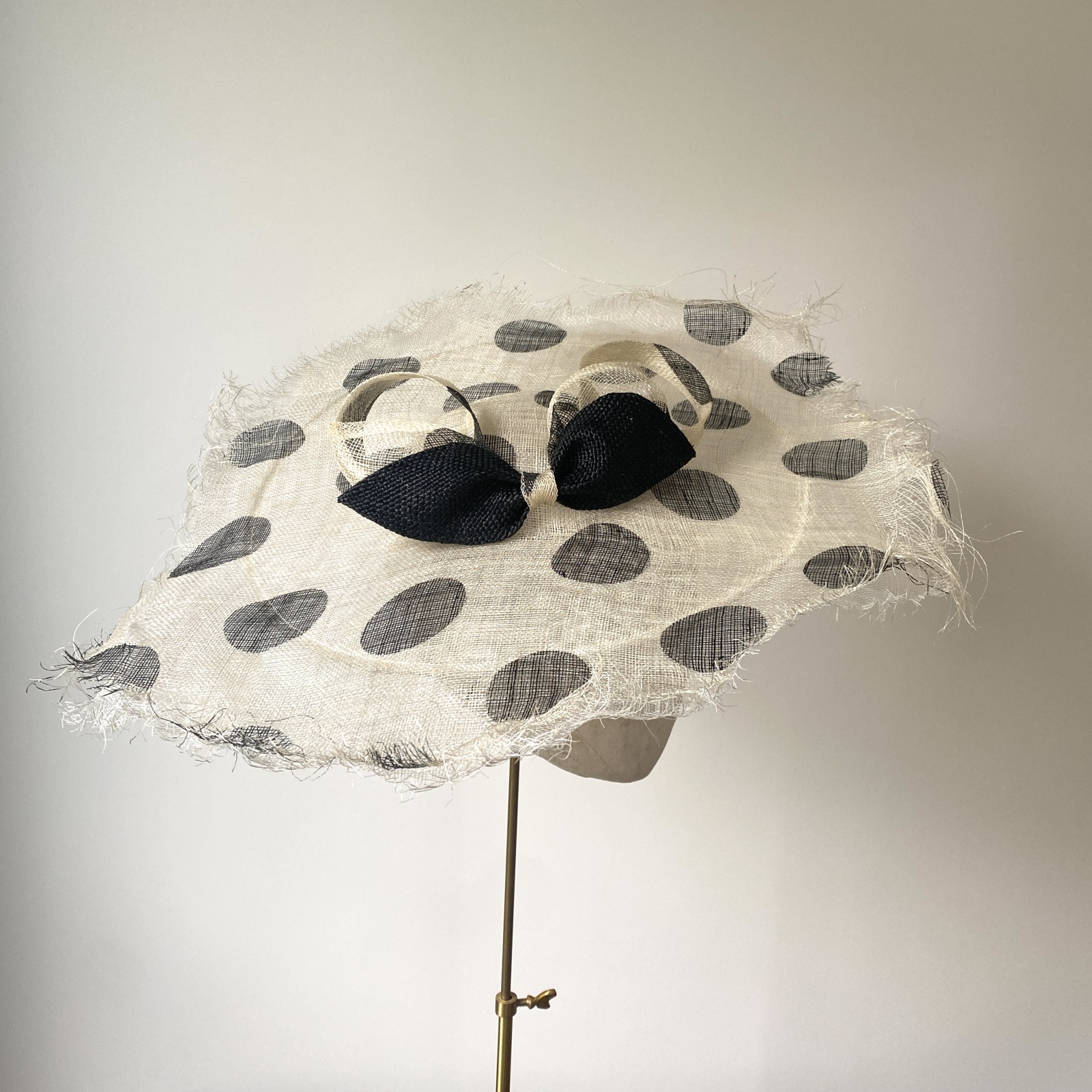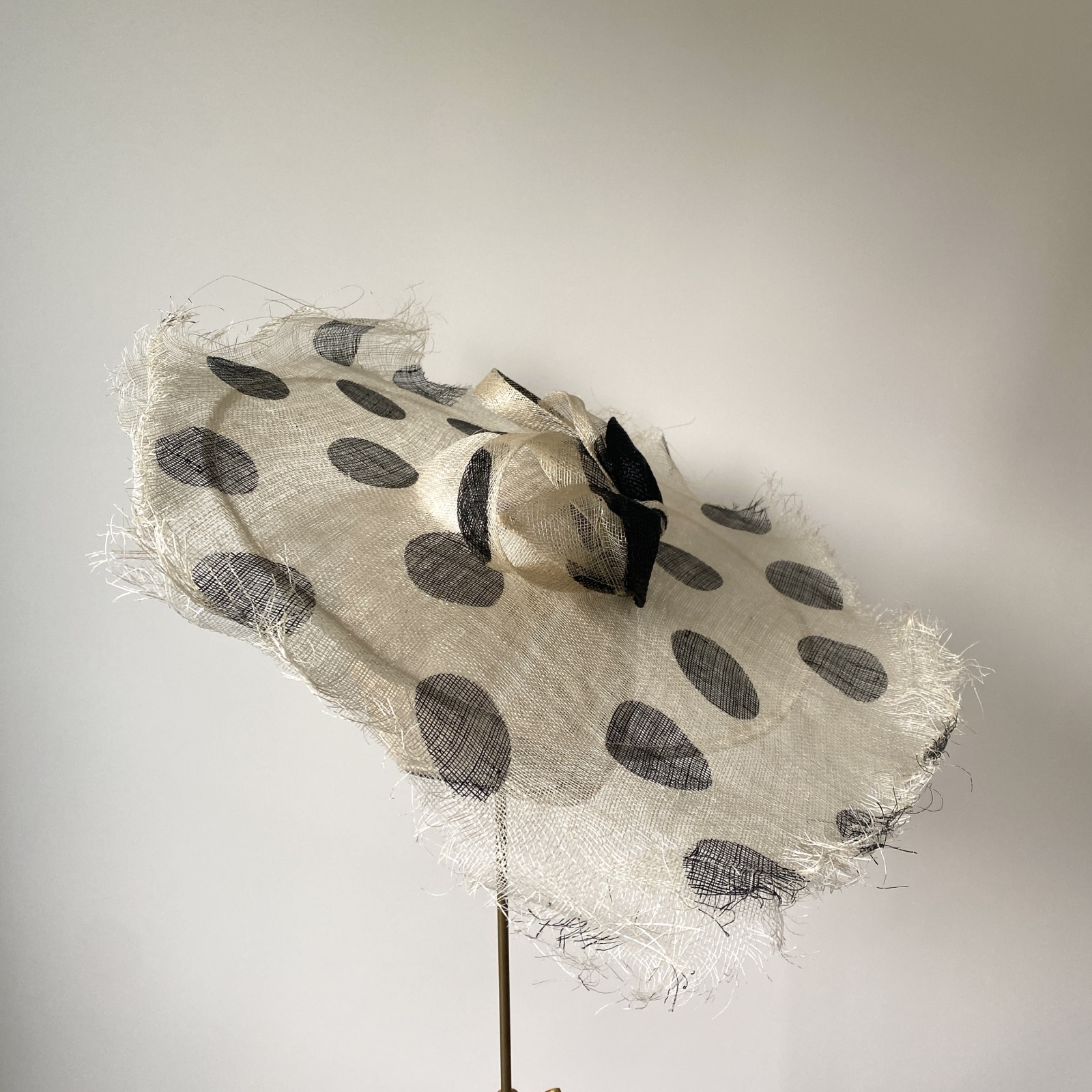 Crafted from monochrome polka-dot printed sinamay and finished with a sculptural black straw bow, it balances classic sophistication with contemporary flair. Artistically distressed edges lend an avant-garde edge, creating a bold yet refined statement.