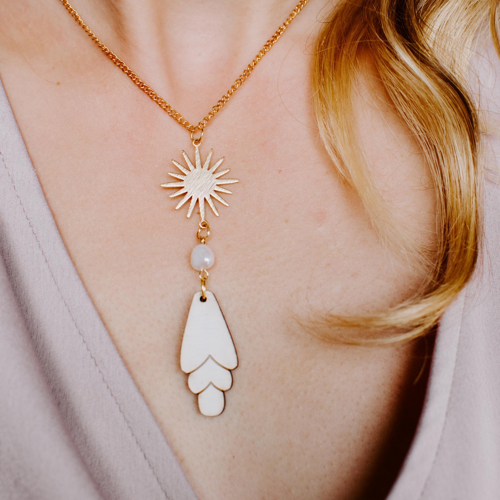Made from: FSC Plywood, fresh water pearl, brass sun charm, gold plated chain.